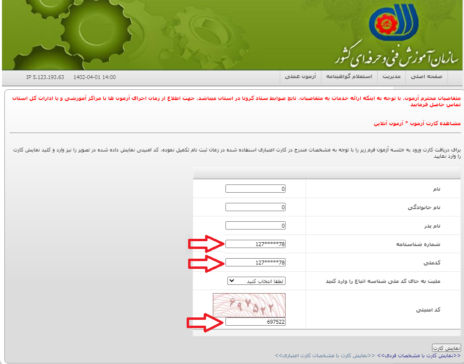 دریافت کارت آزمون فنی و حرفه ای