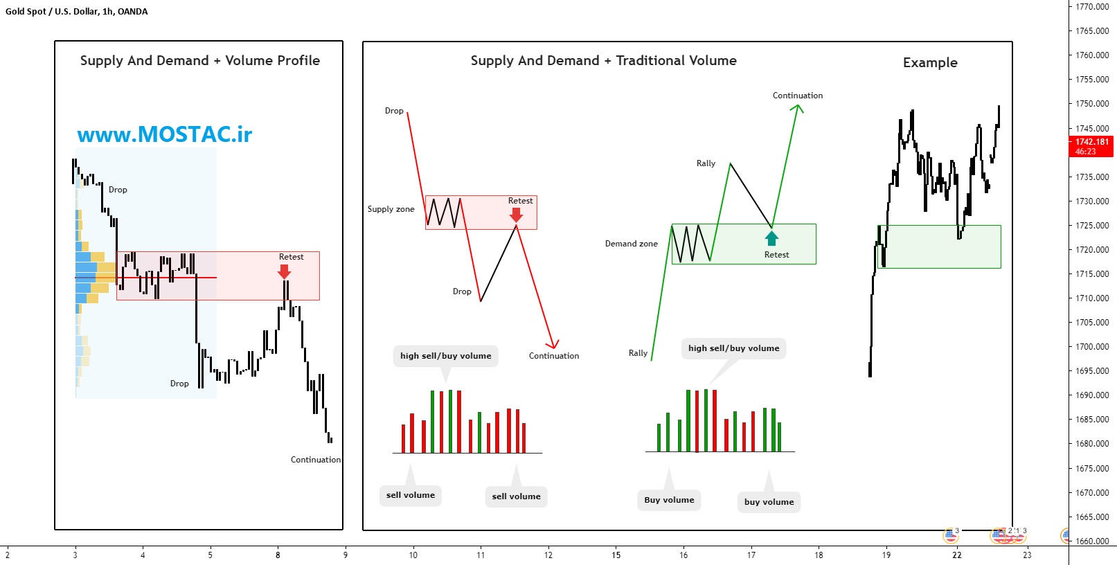 - تأیید تارگتها: اگر تارگت شما (ناحیه عرضه/تقاضای مخالف) نیز همزمان با یک HVN یا POC در Volume Profile باشد، این تارگت را معتبرتر میکند.
